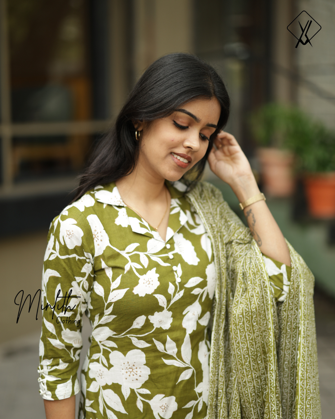 This elegant green outfit features a stylish collar neck with delicate potli ball detailing along the neckline, adding a touch of traditional charm. The dress comes with 3/4th sleeves that create a graceful and balanced look.