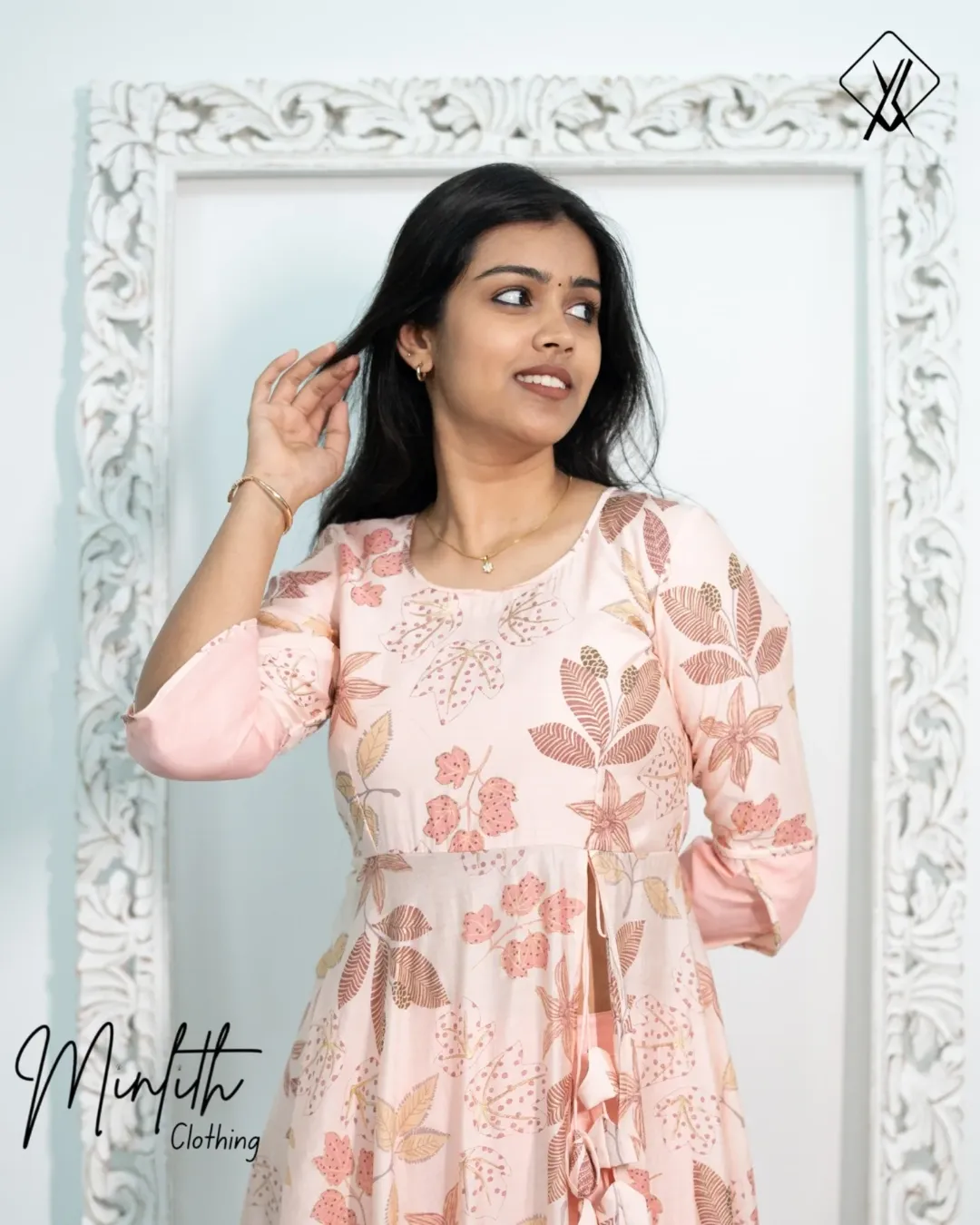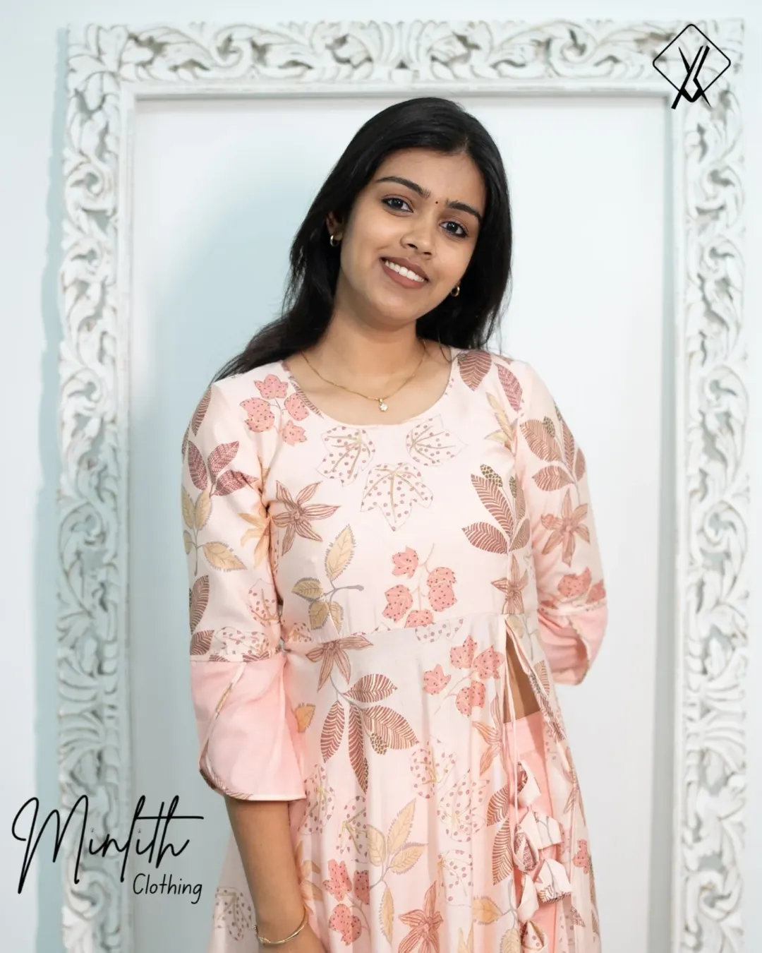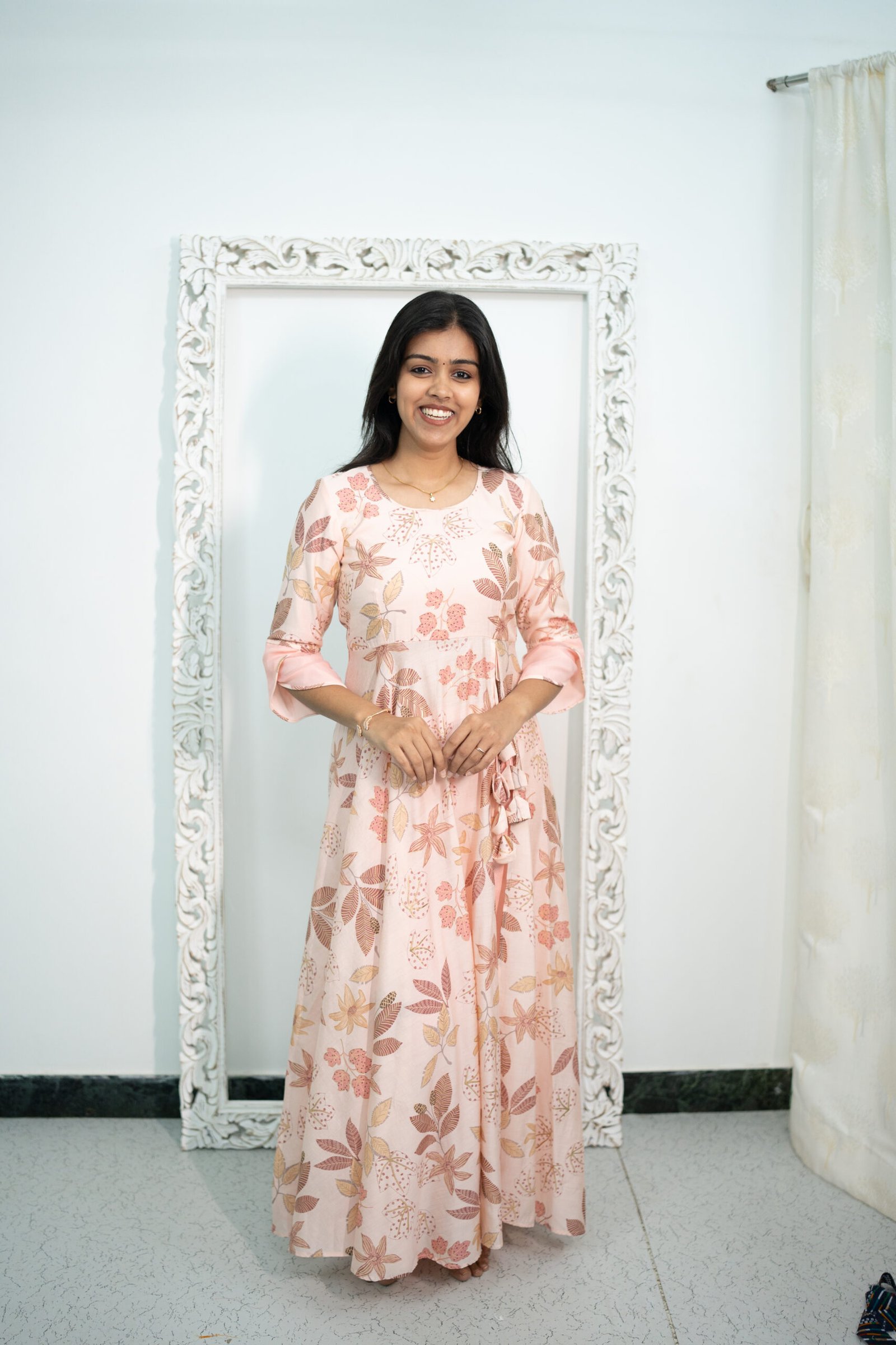 Gracefully designed for a blend of comfort and elegance, this outfit features a peach floral Chanderi cotton top with a flattering mid-cut umbrella silhouette that drapes beautifully and adds a soft, flowy charm. The top is detailed with delicate tassel accents, 3/4th sleeves with Petal Shape detailing and a U-shaped front neckline that enhances the feminine look, while the closed back neckline keeps the design neat and sophisticated.