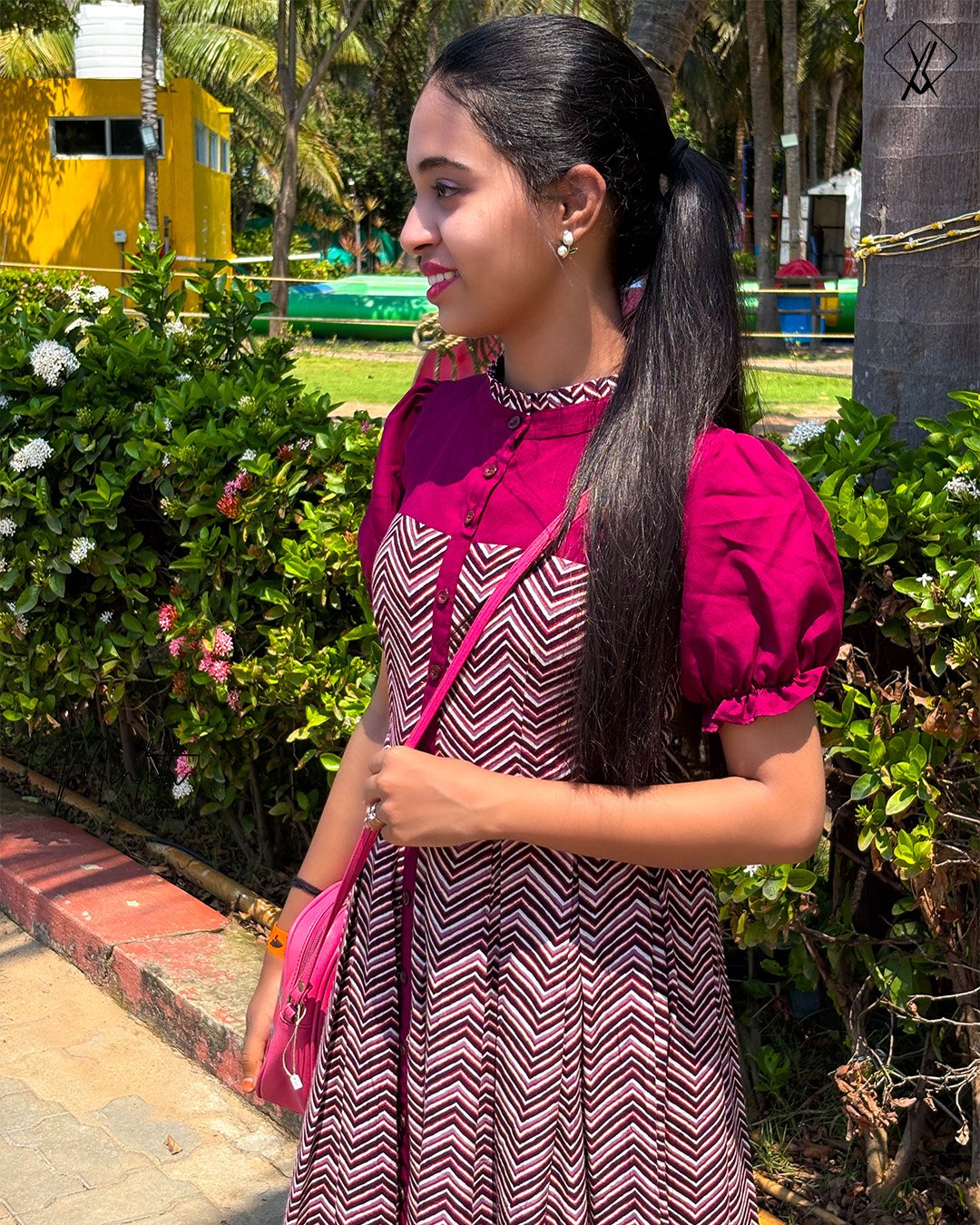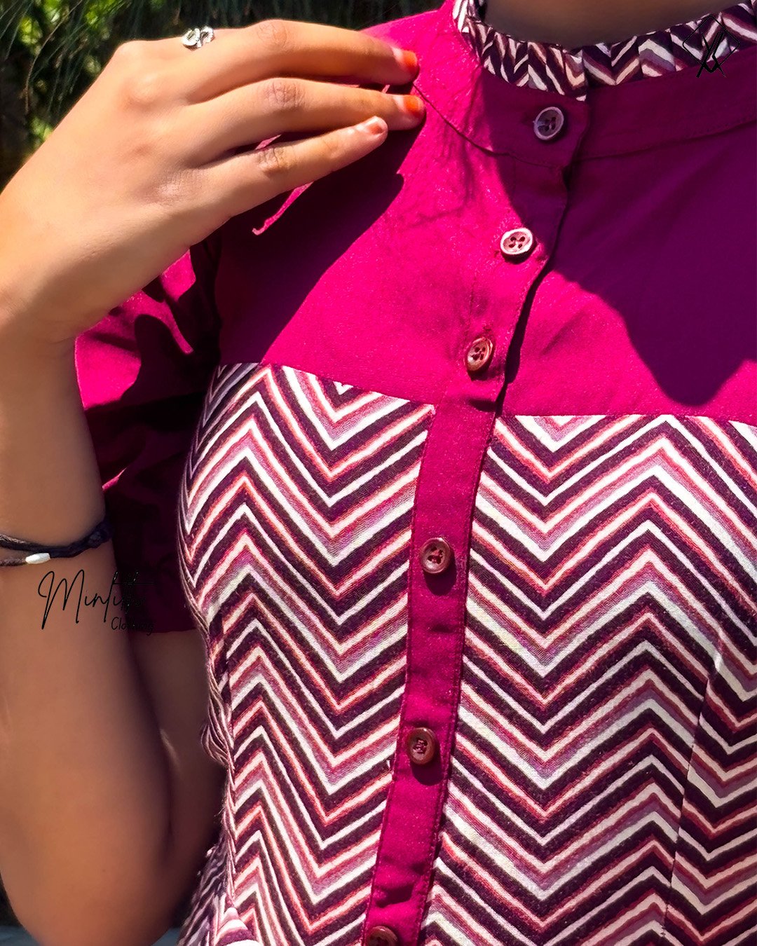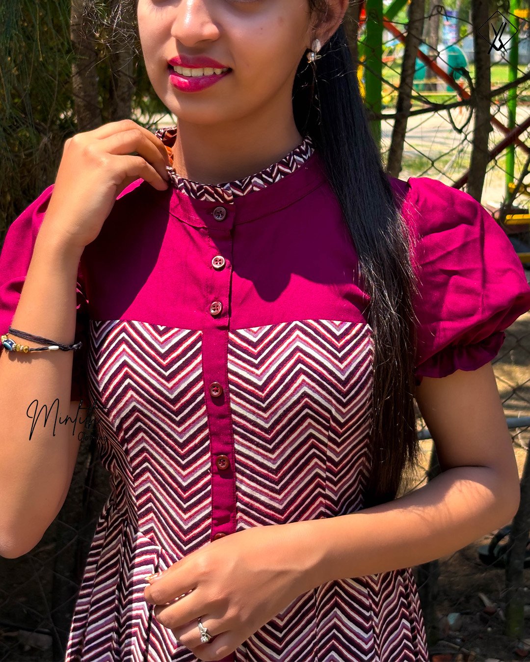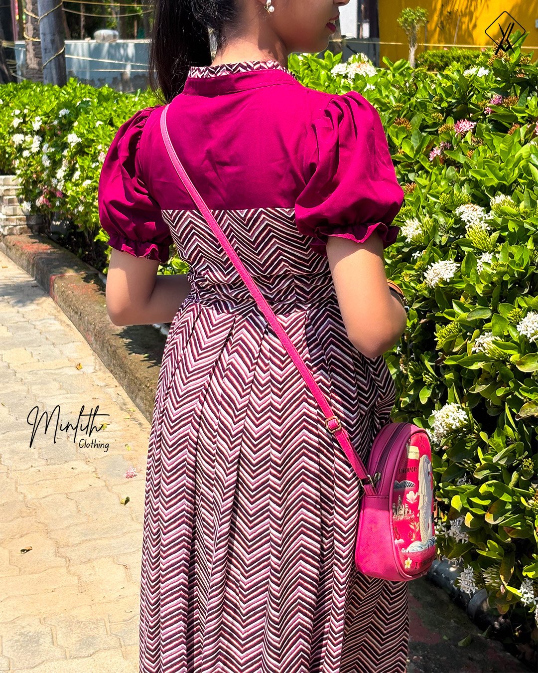 A delightful fusion of contrast and charm, this dress features a deep burgundy yoke with classic buttons flowing into a chevron-printed beige flare. Crafted in soft cotton for all-day comfort, the short puff sleeves and fitted waistline add a playful yet elegant touch.