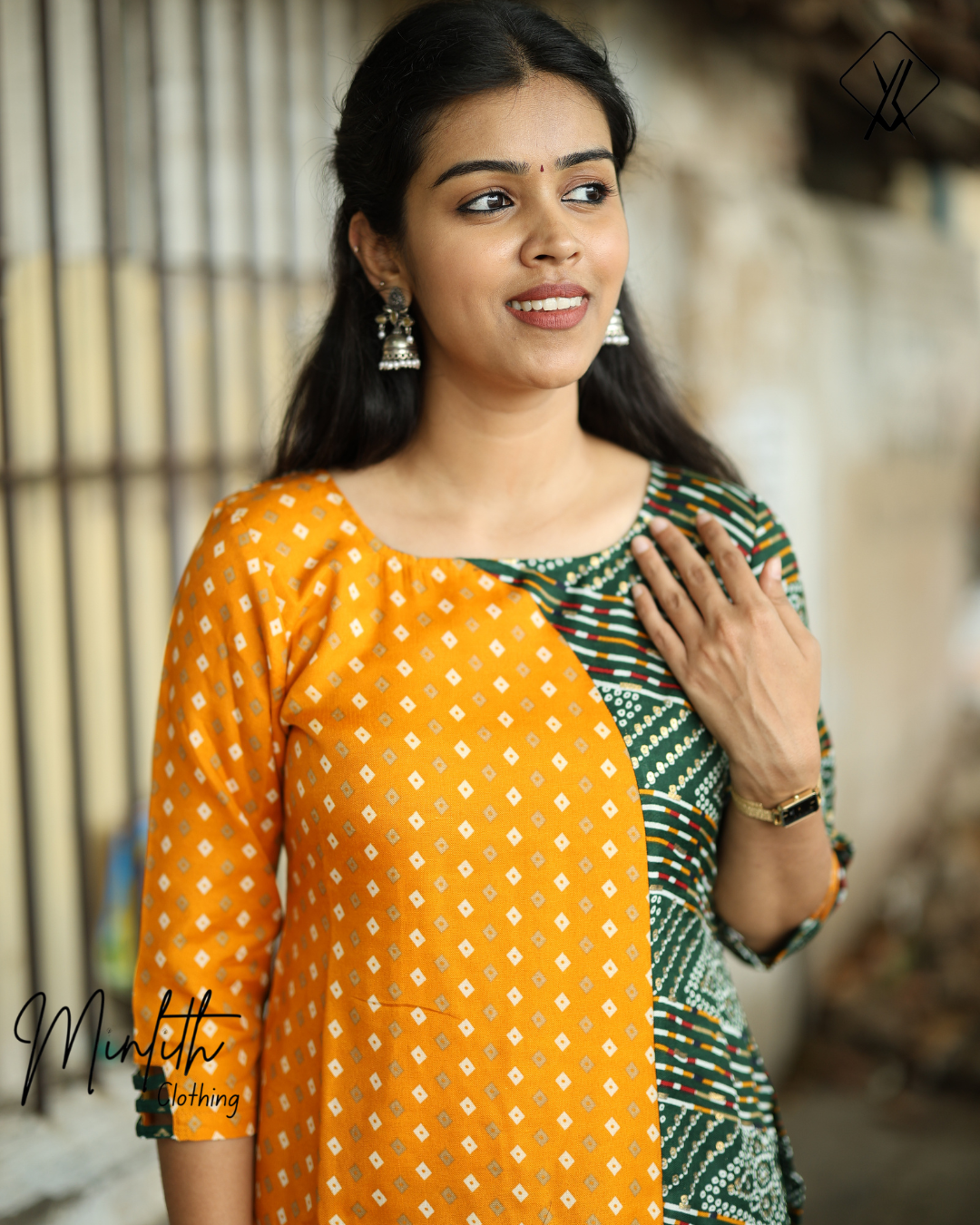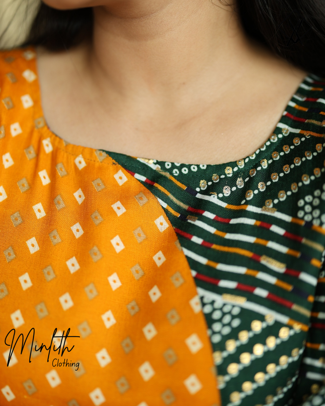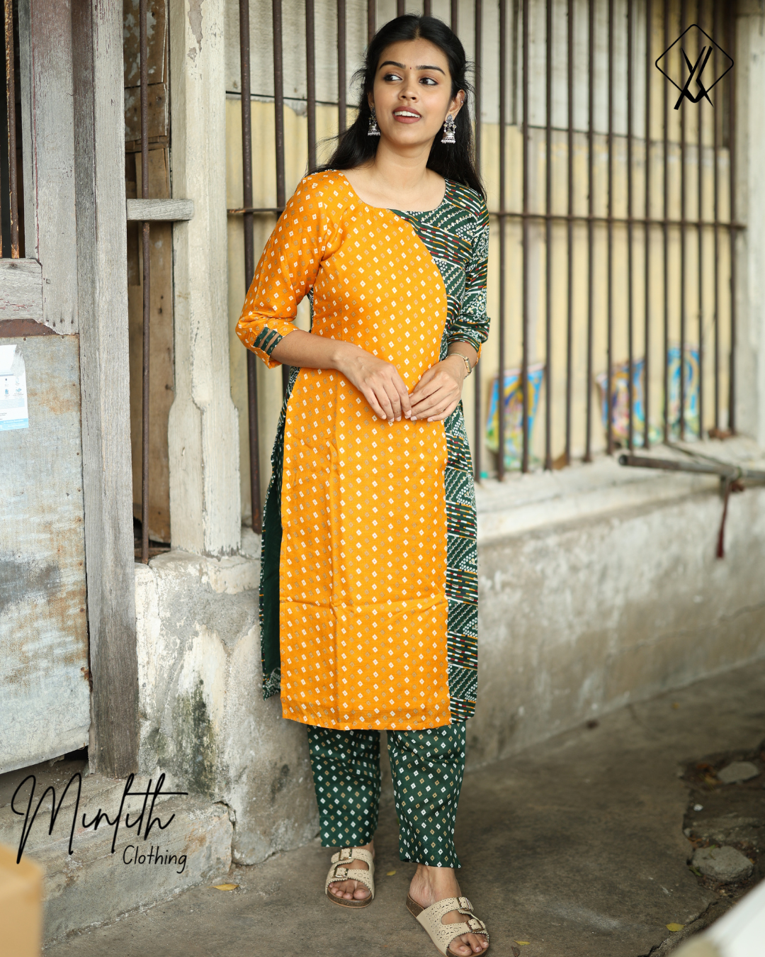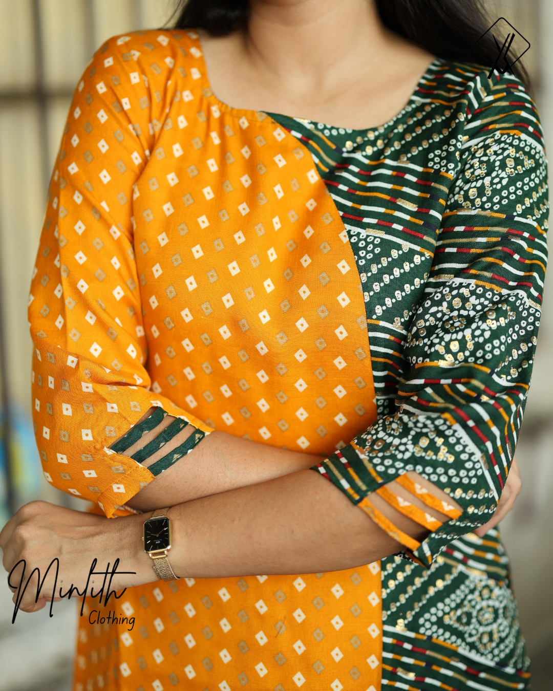 This stylish kurthi set features a front U-neck and a back closed neck, offering a classic yet contemporary silhouette. The 3/4th sleeves are finished with delicate loop detailing on the edges, adding a subtle decorative touch.