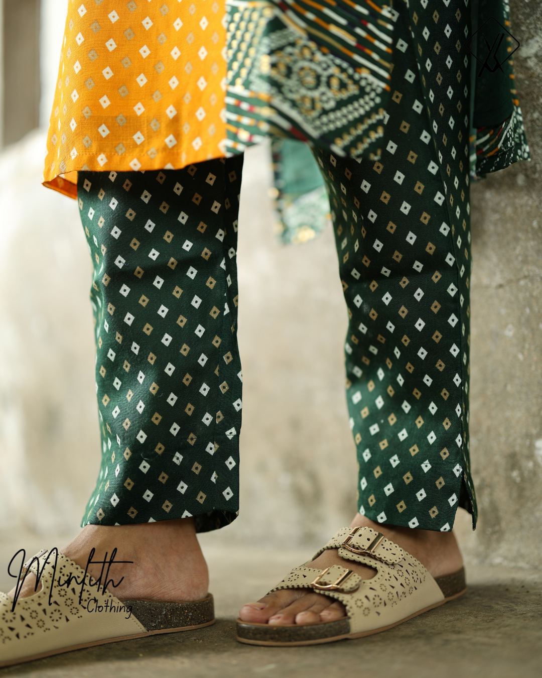 The kurthi is adorned with a charming dot-and-cross pattern, giving it a playful and elegant look suitable for both casual and semi-formal occasions. It is paired with straight-fit pants that come with elasticized waist and functional pockets, ensuring comfort and practicality.
